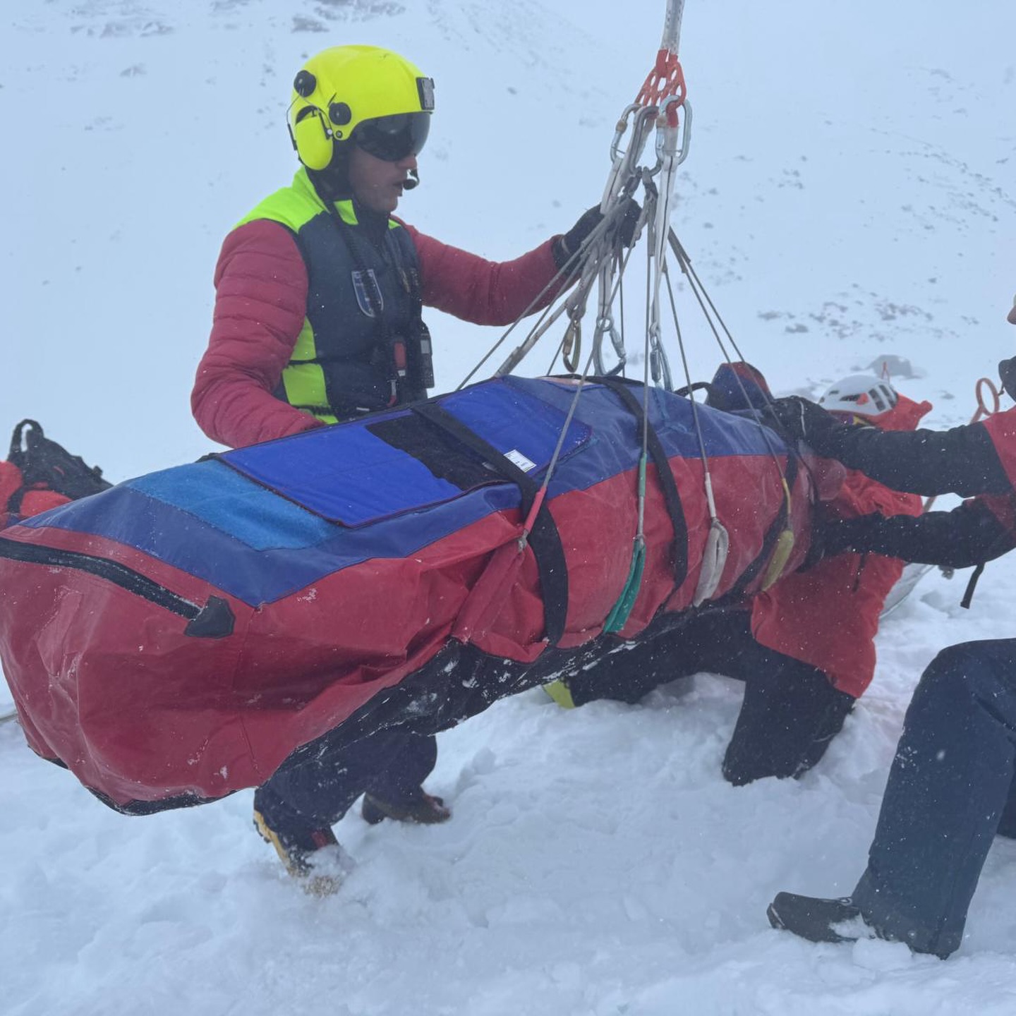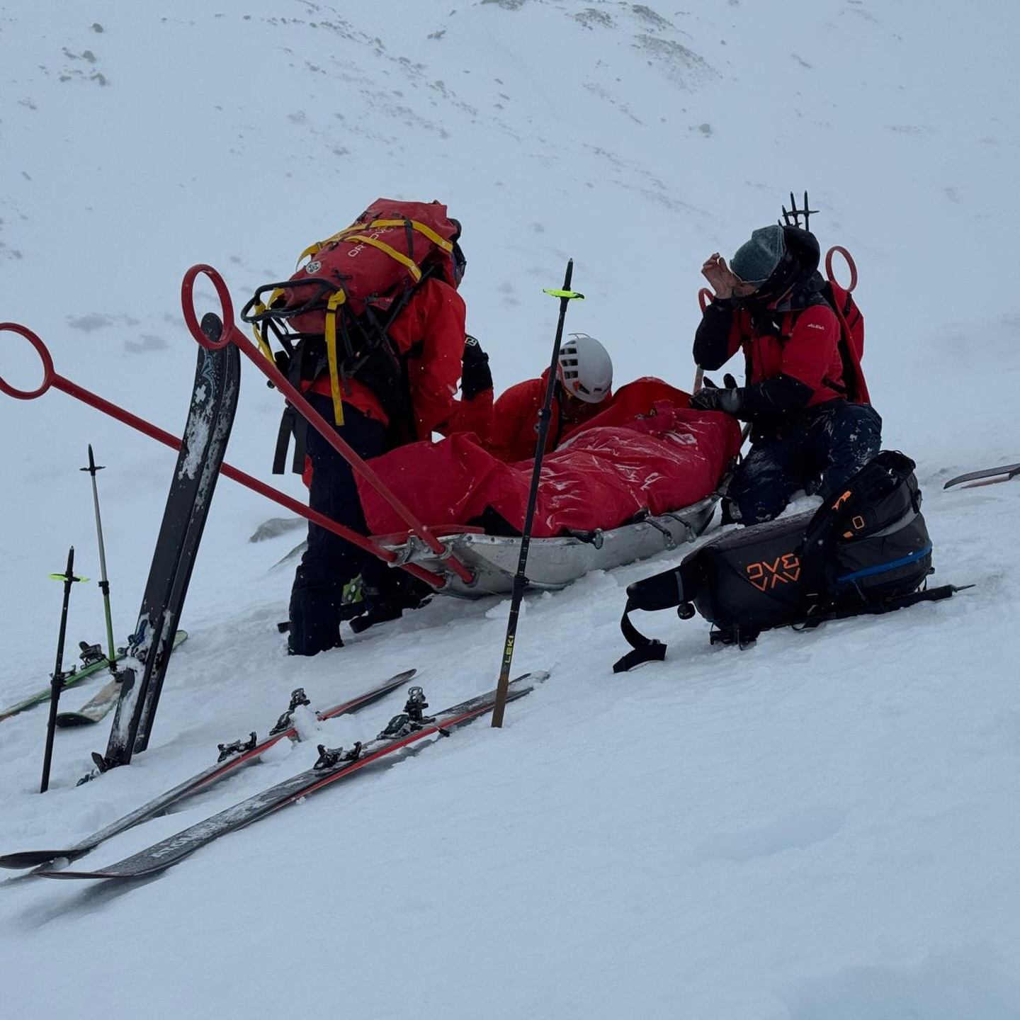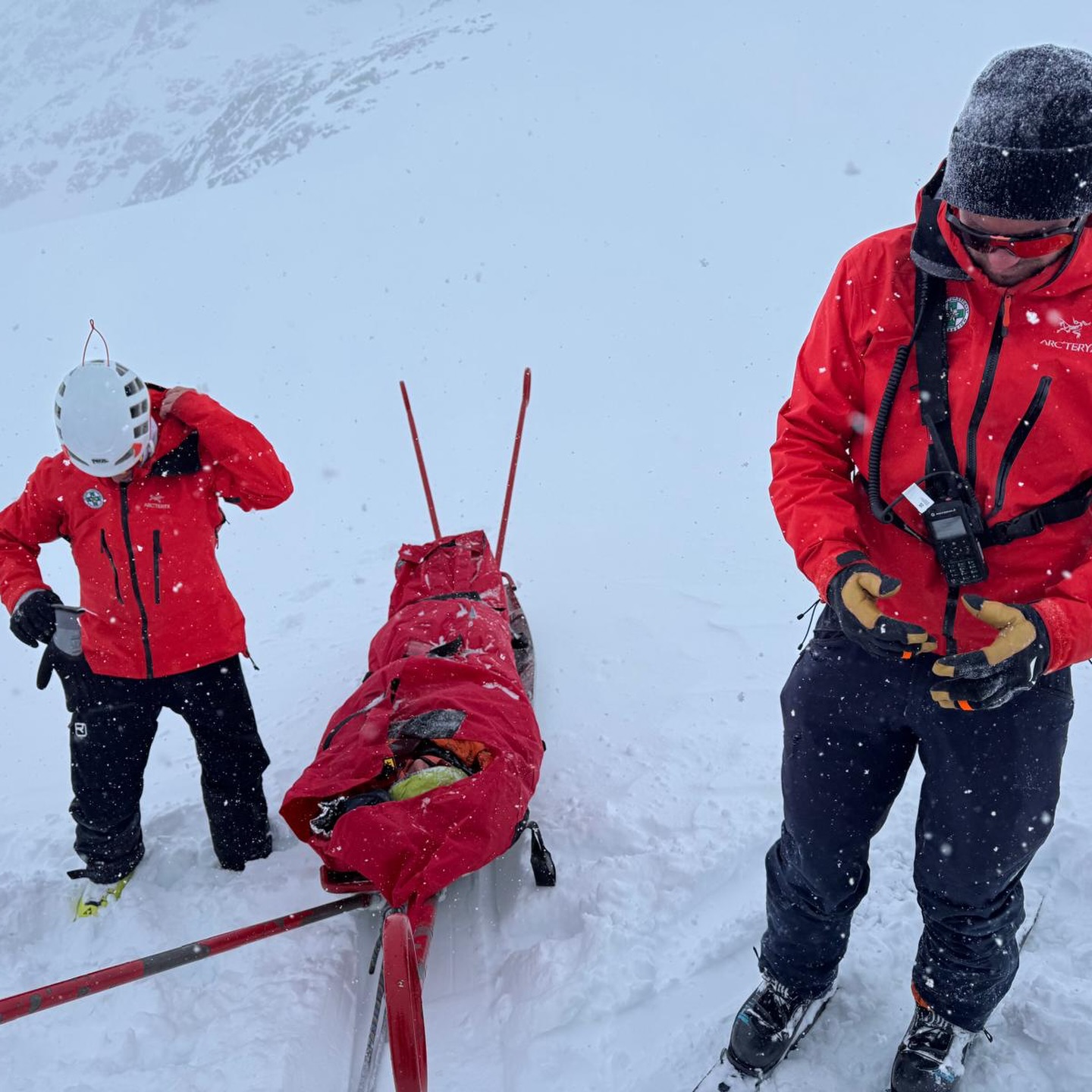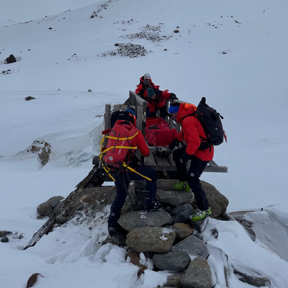 Dem anschließend alarmierten Polizeihubschrauber Libelle gelang es jedoch, unsere Mannschaft bis unterhalb der Vernagthütte zu fliegen. Von dort stiegen die Einsatzkräfte mit Tourenski zur verletzten Person auf. Im Gepäck befanden sich medizinisches Material, Akja, Wärmemanagement sowie eine Vakuummatratze und ein Bergesack.