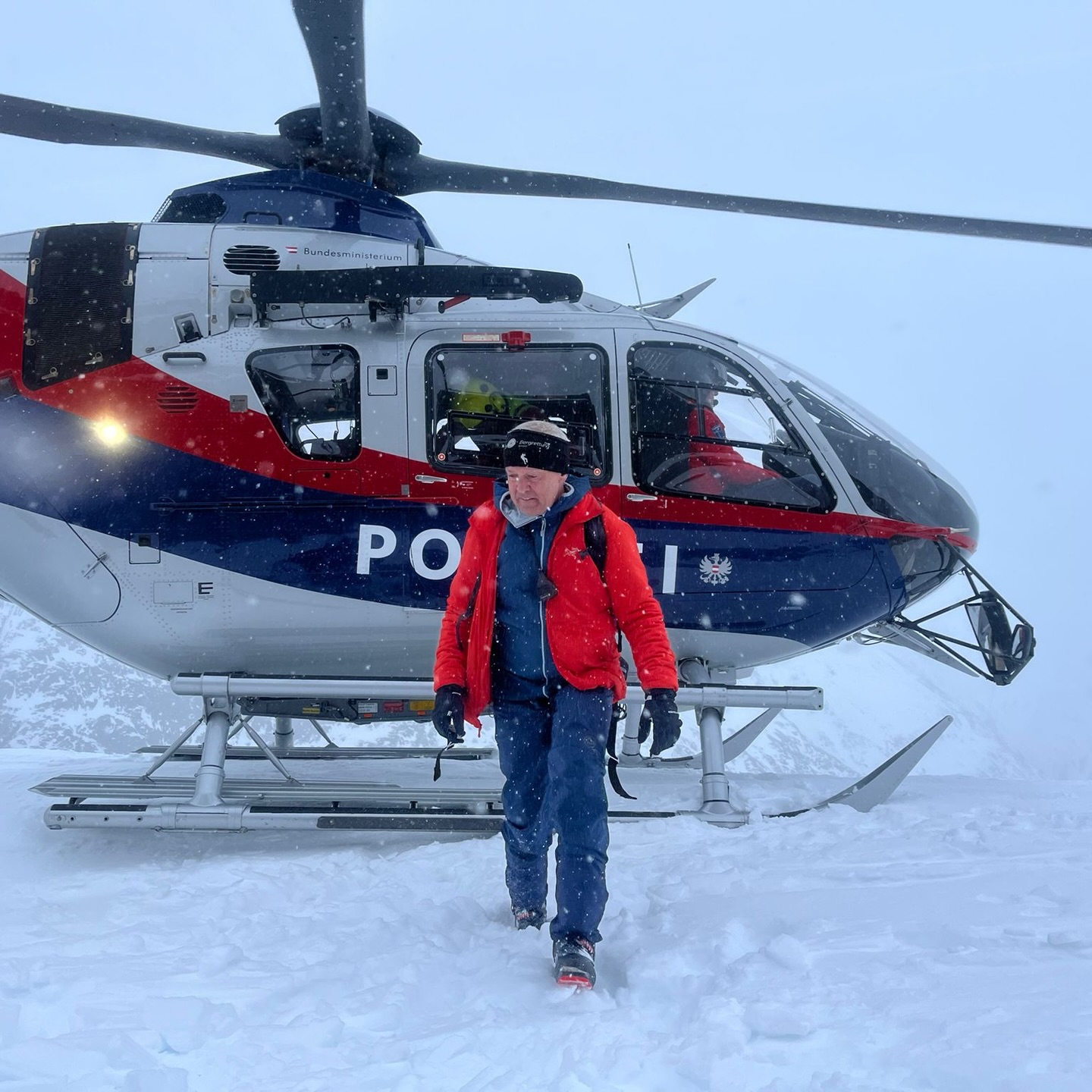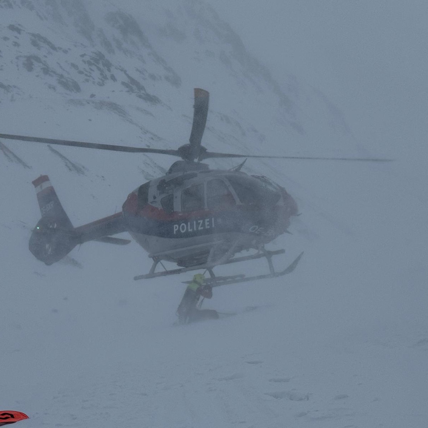 Während des Abtransports konnte eine kurze Wetterbesserung genutzt werden, um die verletzte Person an den Polizeihubschrauber Libelle zu übergeben.